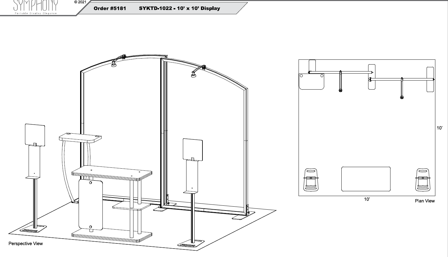 This 10 x 10 modular exhibit set up is perfect for smaller and larger booth spaces. The counter in the front is usable for giveaways and collateral and ships in 3 rolling cases for the counter and back drop. The hand sanitizer stations easily ship in canvas style rolling bags. Ideally, this entire set up can fit on one pallet for shipping directly to shows. The fabric for the backdrop is easy to swap out for different trade shows or conferences and easily purchased through Trinity displays in Indiana. Included in purchase: - Exhibit backdrop frame (no graphics) - Charging counter attachable to back frame with attachable graphic - 2 Hand Sanitizing Stations - 1 three-tiered counter with attachable graphic - All Shipping Cases - Attachable Lighting for backdrop - Set up Instructions / Assembly with Case packing instructions.
