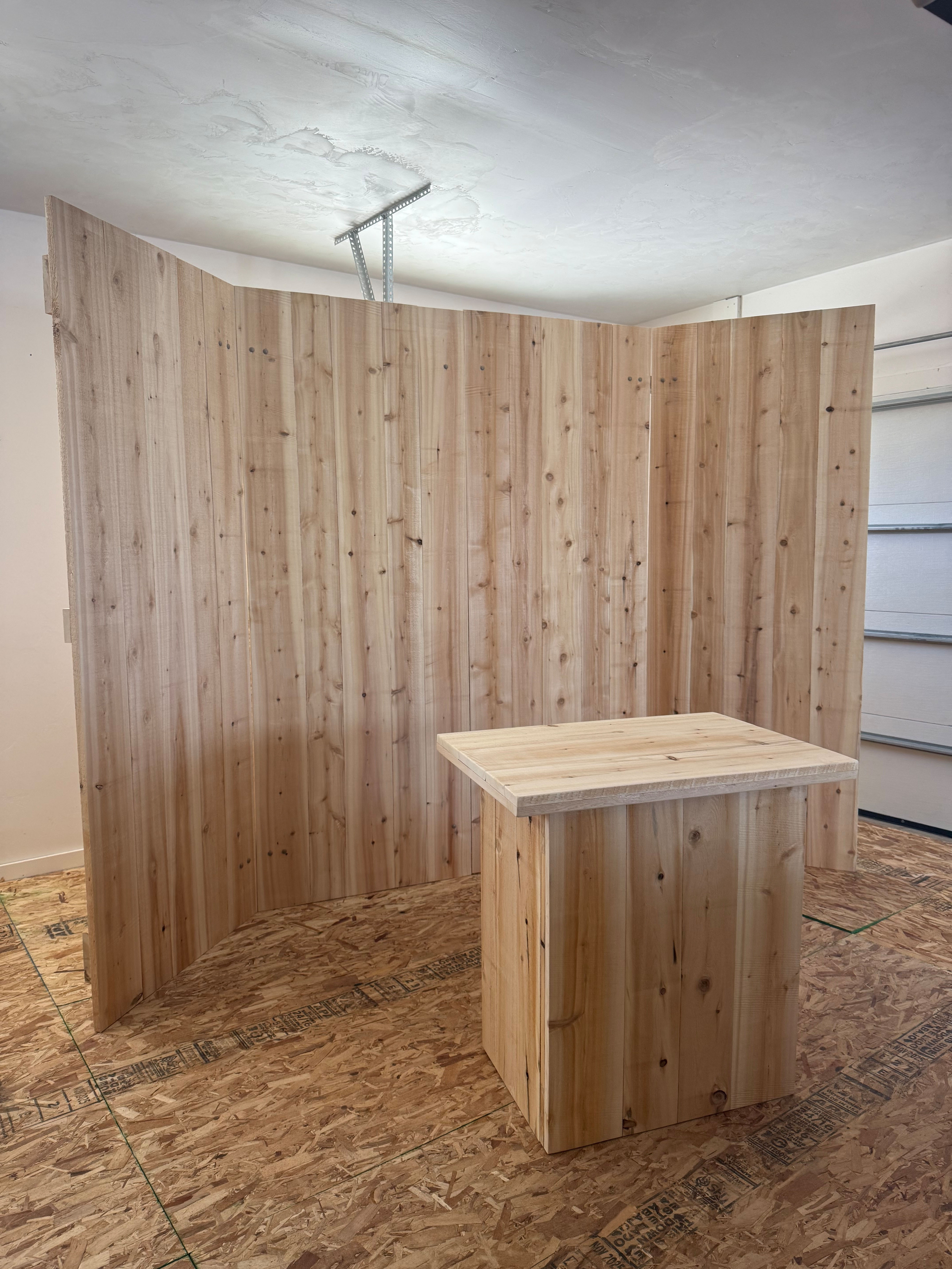10x10 Rustic natural cedar wood booth exhibit with counter. "SET UP NO TOOLS NEEDED" Comes with 4 shelves for the back wall.